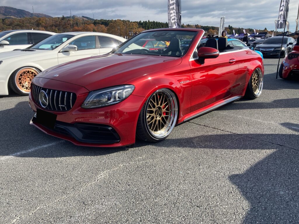 富士スピードウェイstanceお手伝い、Office Mさん一行に勝手にお邪魔してきました。 某AMG205C63Sのお披露目に参加 絶望的なサイズのBBS&エアサス&アーム ホイル被りがエロいっす